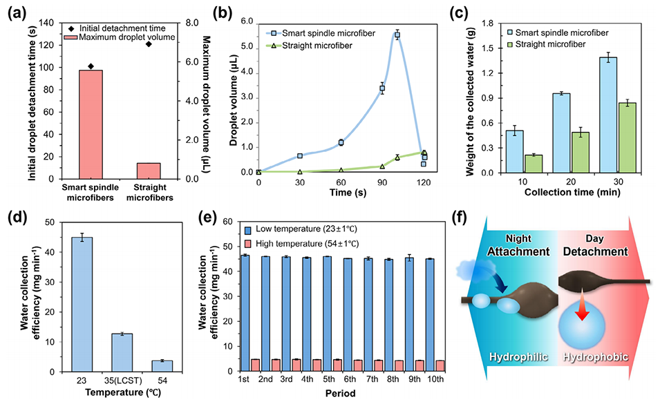图4. SSMs 的雾收集能力。(a) SSMs 与直微纤维的初始液滴脱落时间及最大液滴体积对比。(b) 直微纤维与 SSMs 上液滴体积随时间的变化。(c) 相同收集时间内,SSMs 与直微纤维的集水量对比,凸显雾收集效率差异。(d) SSMs 在低于、接近及高于最低临界溶解温度(LCST,35℃)的不同温度下的雾收集效率。(e) 循环温度变化下 SSMs 的雾收集效率,体现其稳定的性能重复性。(f) SSMs 在不同环境条件下的热适应性示意图。