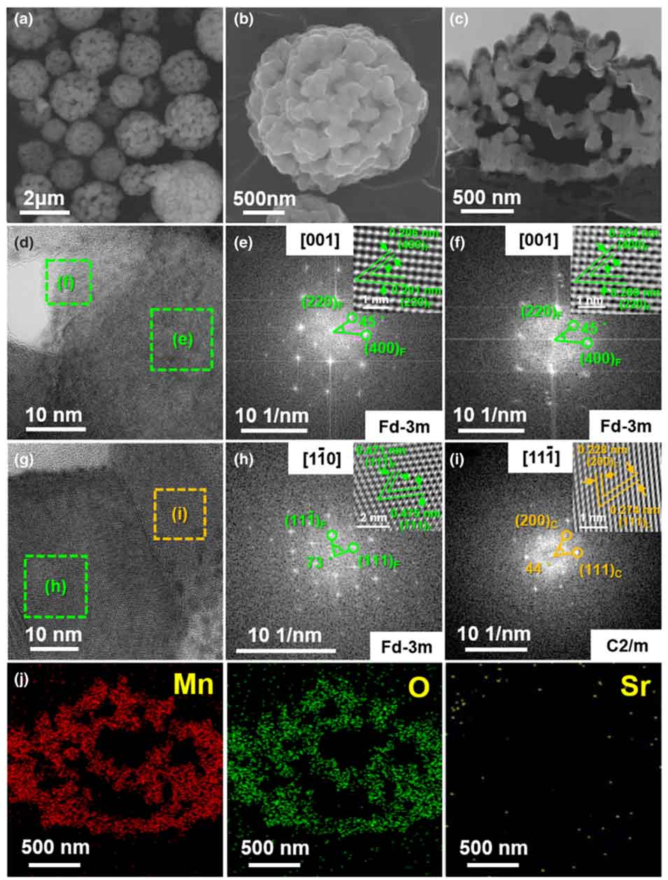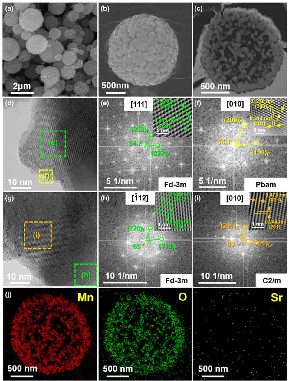 图3 Sr-LMO 的形貌与结构表征:(a, b) 不同倍率下的场发射扫描电子显微镜(FE-SEM)图像;(c) 聚焦离子束(FIB)处理后的截面场发射扫描电子显微镜(FE-SEM)图像;(d, g) 高分辨透射电子显微镜(HR-TEM)图像;(e, f, h, i) 所选区域的快速傅里叶变换(FFT)衍射图谱及对应的逆快速傅里叶变换(IFFT)图像;(j) 元素映射图像。