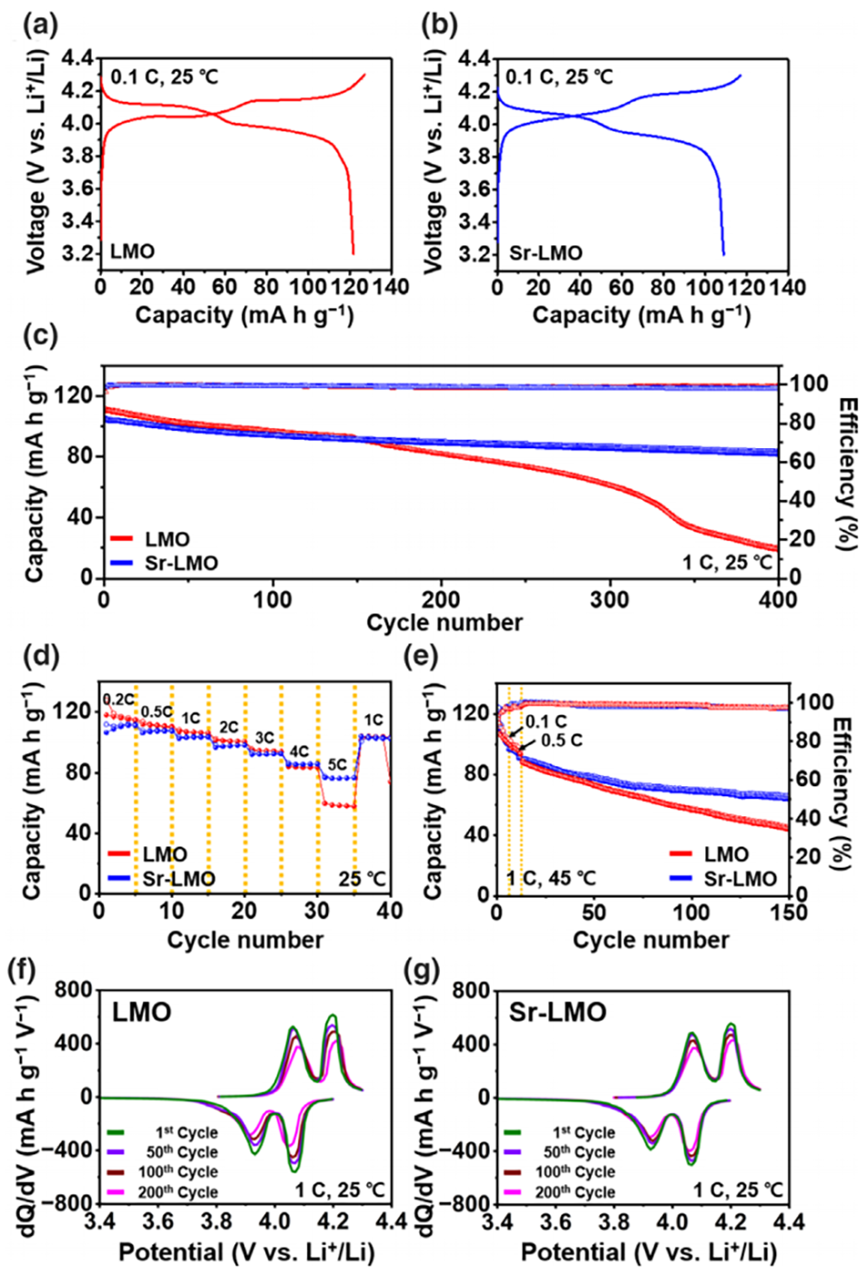 图5 LMO 和 Sr-LMO 的电化学性能:(a, b) 0.1C 倍率下的充放电曲线;(c) 25°C、1C 倍率下的循环性能;(d) 不同电流密度下的倍率性能;(e) 45°C 高温、1C 倍率下的循环稳定性;(f, g) 分别为 LMO 和 Sr-LMO 在 1C 倍率下循环 200 次过程中的微分容量-电压(dQ/dV)曲线。