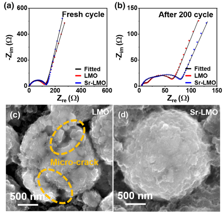 图6 LMO 和 Sr-LMO 电极的电化学阻抗谱(EIS):(a) 处于初始状态的电池的测试结果;(b) 循环 200 次后的测试结果;(c, d) 循环 200 次后电极的场发射扫描电子显微镜(FE-SEM)图像:(c) LMO 电极、(d) Sr-LMO 电极。