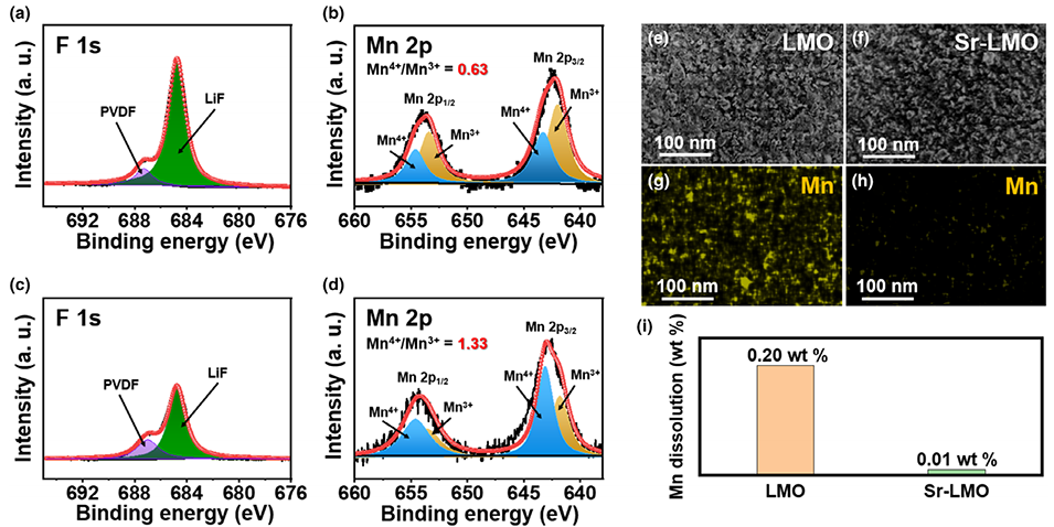 图7 循环后分析:循环 200 次后的 X 射线光电子能谱(XPS)窄扫图谱:(a, b) LMO 电极的 F 1s 轨道和 Mn 2p 轨道;(c, d) Sr-LMO 电极的 F 1s 轨道和 Mn 2p 轨道;(e, f) 分别为与 LMO 和 Sr-LMO 配对的全电池中,循环 200 次后石墨负极的场发射扫描电子显微镜(FE-SEM)图像;(g, h) 与 LMO 和 Sr-LMO 配对的石墨负极的 Mn 元素映射图像;(i) 根据能量色散谱(EDS)分析得到的 Mn 质量浓度。