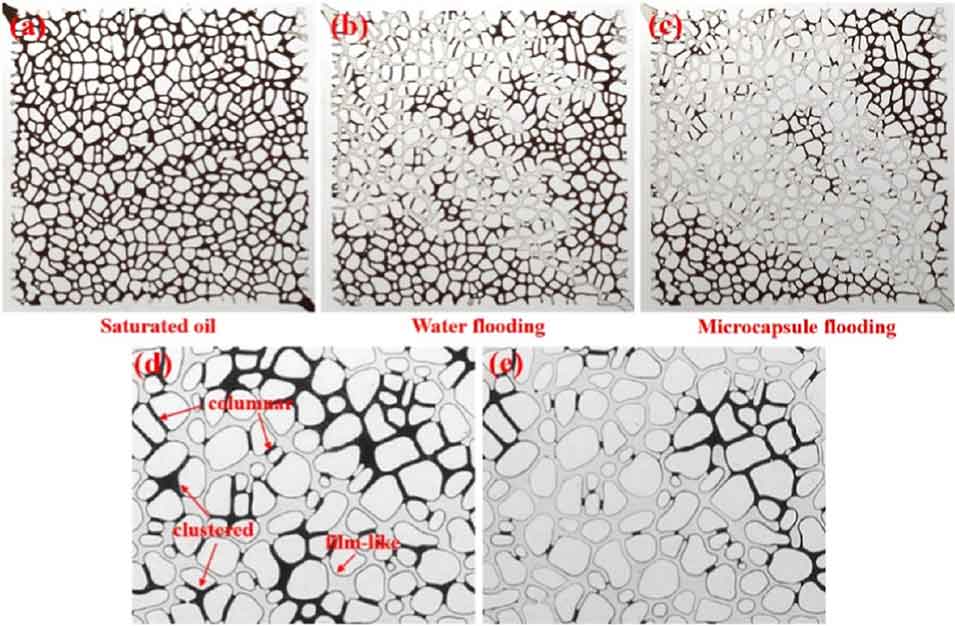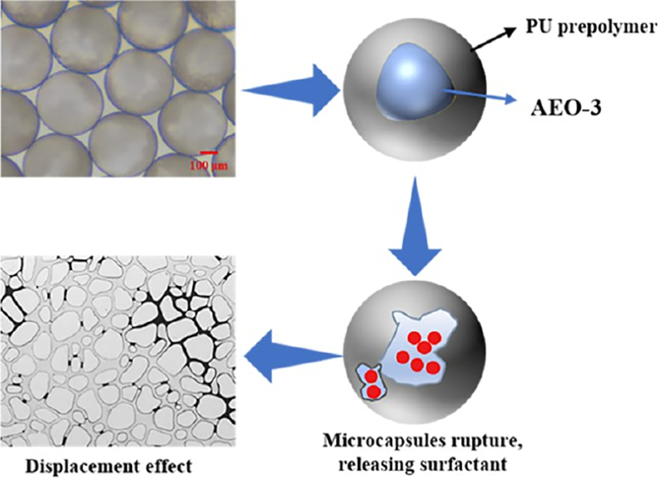 4、微观驱油实验表明,该微胶囊可通过靶向释放表面活性剂、降低油水界面张力及改变岩石润湿性,多方面改善原油剥离与流动特性,有效提高原油采收率,为智能驱油剂的发展提供了有力支持。