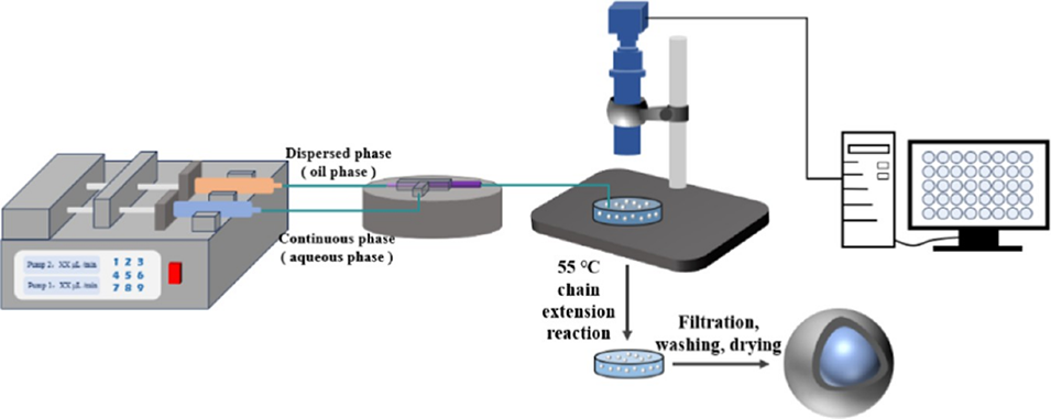 1、微流控装置的结构化设计:采用流动聚焦型微流控装置,由注射器针头、T 型塑料接头和不锈钢毛细管组装而成,确保分散相(油相)在连续相(水相)中形成单分散液滴。装置组装时严格保证中心轴同轴对齐,固定于载玻片以避免操作中偏移,从源头控制液滴生成的一致性。