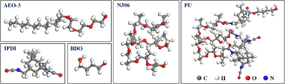 图3 AEO-3、IPDI、BDO、N306 及聚氨酯(PU)的分子结构