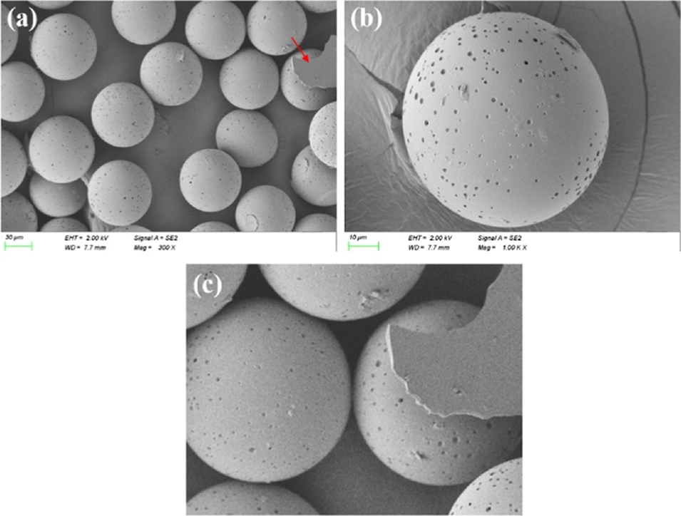 图6 微胶囊的扫描电子显微镜(SEM)图像:(a)微胶囊的整体形貌及壳层破裂情况(红色箭头所示);(b)微胶囊的表面形貌;(c)微胶囊壳层的内表面形貌