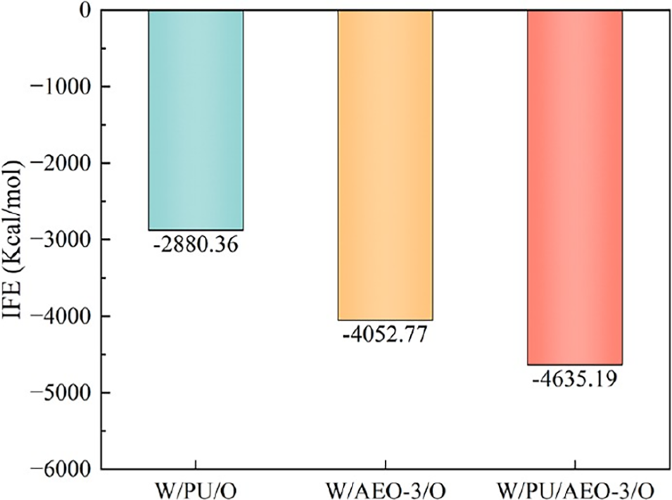 图12 油水体系的平衡结构:(a)水 / 聚氨酯 / 油(W/PU/O)体系;(b)水 / AEO-3 / 油(W/AEO-3/O)体系;(c)水 / 聚氨酯 / AEO-3 / 油(W/PU/AEO-3/O)体系