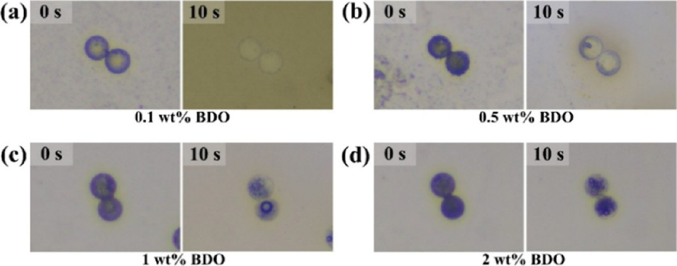 图17 不同扩链剂用量制备的微胶囊在重质油中溶解的光学显微镜图像:(a)0.1wt% BDO;(b)0.5wt% BDO;(c)1wt% BDO;(d)2wt% BDO