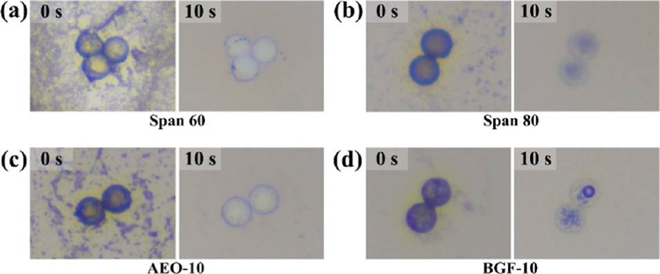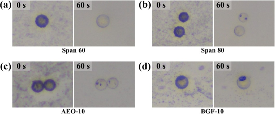 图19 封装不同表面活性剂的微胶囊在重质油中溶解的光学显微镜图像:(a)Span 60;(b)Span 80;(c)AEO-10;(d)BGF-10