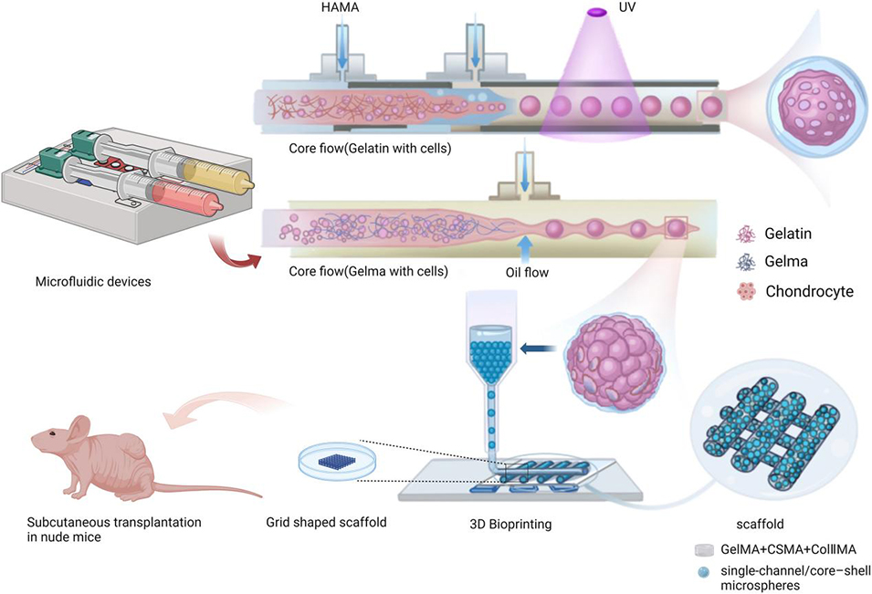 图1 微流控辅助制备负载软骨细胞的微球及 3D 生物打印网格状支架用于耳廓软骨再生的工艺示意图。毛细管微流控装置可生成两种形式的构建单元:(i)核壳结构微球,其甲基丙烯酰化透明质酸(HAMA)外壳包裹负载软骨细胞的明胶内核,并在 405nm 紫外光下光交联;(ii)单通道微球,由甲基丙烯酰化明胶(GelMA)- 软骨细胞内核流经油相剪切形成。随后,这些生物活性微球与 GelMA/CSMA/ColIIMA 光交联水凝胶基质混合,配制复合生物墨水,通过挤出式 3D 生物打印沉积为网格状支架,随后皮下植入裸鼠体内。