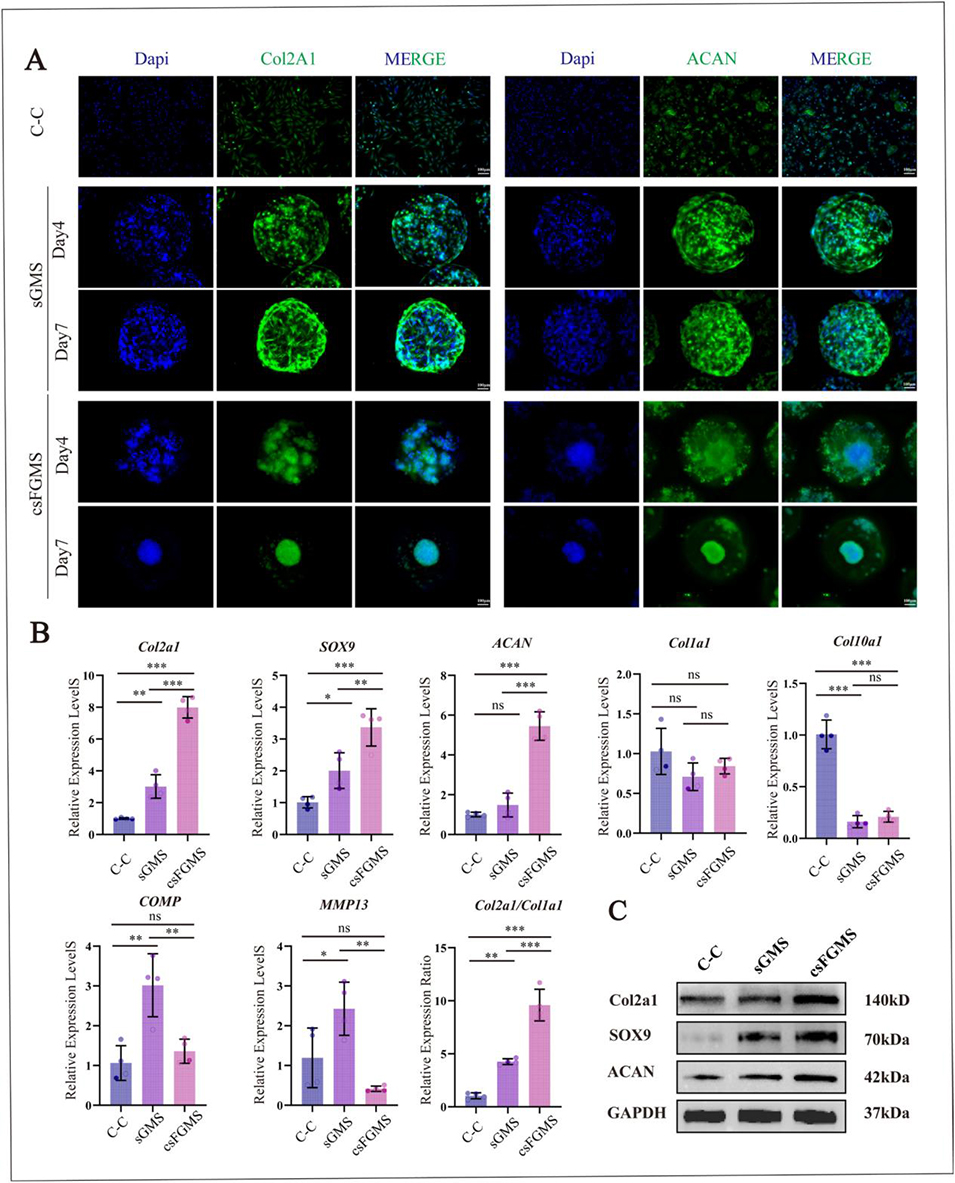 软骨形成能力差异核心原因:csFGMS 的 HAMA 外壳模拟了天然软骨的细胞周基质,可缓冲打印和培养过程中的剪切力与渗透压扰动,调控溶质运输,暂时保留新生基质,为 SOX9 驱动的软骨形成程序提供稳定微环境,从而更有效地维持软骨细胞表型,促进 ECM 沉积;而 sGMS 缺乏该缓冲层,细胞微环境稳定性稍差,软骨形成相关标志物(Col2A1、ACAN 等)表达强度低于 csFGMS 组。