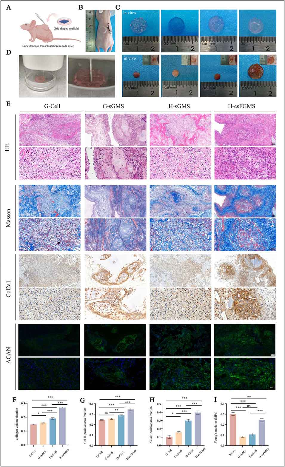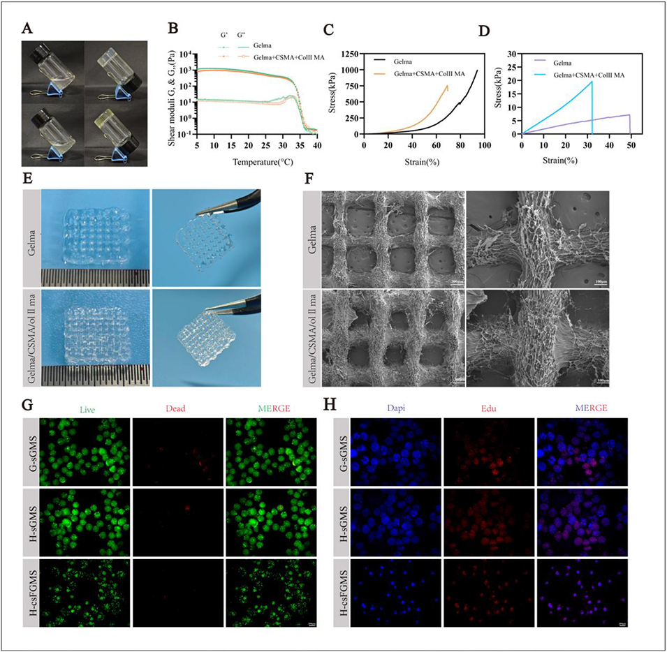 图5 (A)紫外光交联后的构建体照片,显示其高形状保真度。(B)温度扫描流变学结果(5-40℃,升温速率 1.75℃/min):储能模量/损耗模量及凝胶点。(C-D)压缩和拉伸应力-应变曲线及模量(GelMA:压缩模量 0.126MPa,拉伸模量 0.0154MPa;复合水凝胶:压缩模量 0.298MPa,拉伸模量 0.0559MPa)。(E)打印的网格状构建体,显示丝束完整性和可操作性。(F)SEM显微照片,显示相互连通的多孔结构。(G)培养后打印的 G-sGMS、H-sGMS 和 H-csFGMS 网格中软骨细胞的活/死染色结果,显示绝大多数细胞存活,仅少数碘化丙啶阳性细胞。(H)相同构建体的 5 - 乙炔基 - 2'- 脱氧尿苷(EdU)染色结果,显示打印丝束中增殖的软骨细胞。柱形图表示平均值 ± 标准差,n=3 个生物学重复;采用单因素方差分析结合杜凯氏事后检验,图中标注显著性(*p<0.05,**p<0.01,***p<0.001)。比例尺:(F 左图)300μm;(F 右图)100μm;(G、H)200μm。