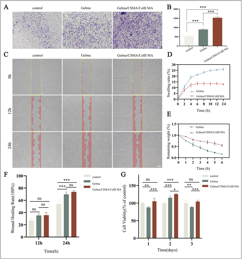 图6 (A)不同条件下软骨细胞的 Transwell 迁移实验结果。(B)迁移细胞定量分析。(C)0、12 和 24 小时的代表性划痕愈合实验图像。(D)溶胀比动力学曲线。(E)在胶原蛋白酶/透明质酸酶中酶解的剩余质量随时间变化曲线。(F)划痕愈合率定量分析。(G)1-3 天的细胞计数试剂盒 - 8(CCK-8)增殖检测结果。柱形图表示平均值 ± 标准差,n=3 个生物学重复;采用单因素方差分析结合杜凯氏事后检验,图中标注显著性(*p<0.05,**p<0.01,***p<0.001)。比例尺:(A)100μm;(C)100μm。