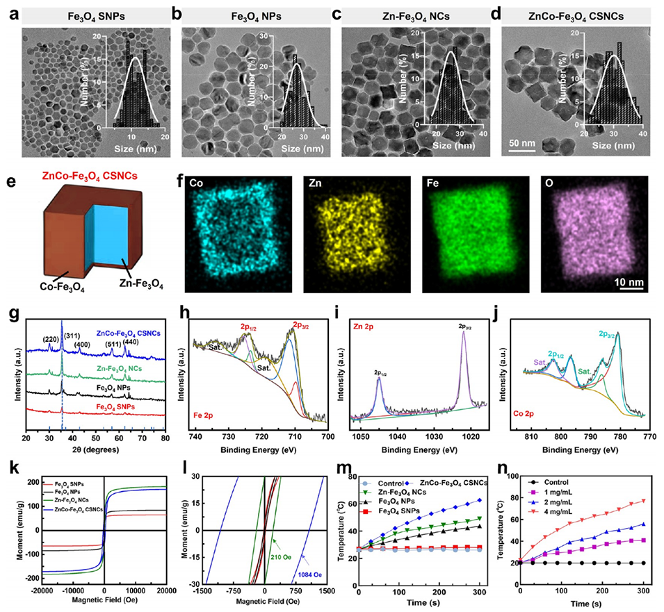 图1. ZnCo-Fe₃O₄核壳纳米立方体(CSNCs)的制备与表征。