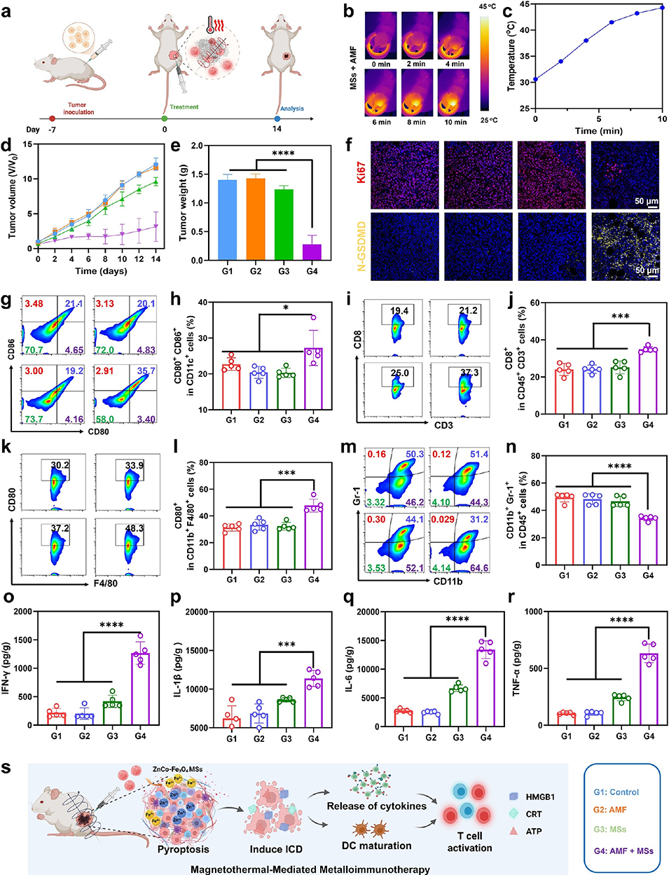 2、在交变磁场(AMF)作用下,ZnCo-Fe₃O₄ MSs实现温度依赖性离子释放、局部高温生成,同时通过代谢干扰抑制热休克蛋白(HSP)上调,协同触发肿瘤细胞焦亡,激活免疫应答(如树突状细胞成熟、CD8⁺T细胞浸润等),重塑免疫抑制性肿瘤微环境(TME)。