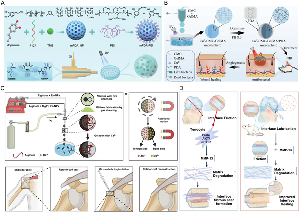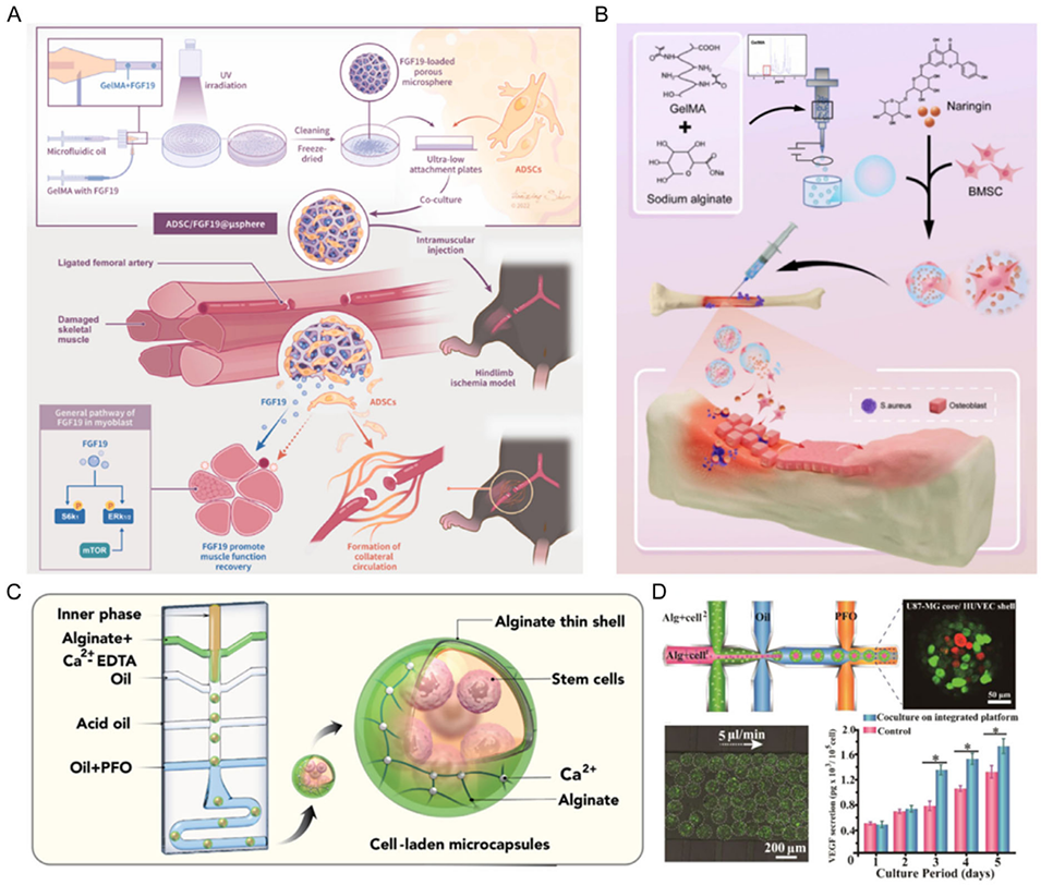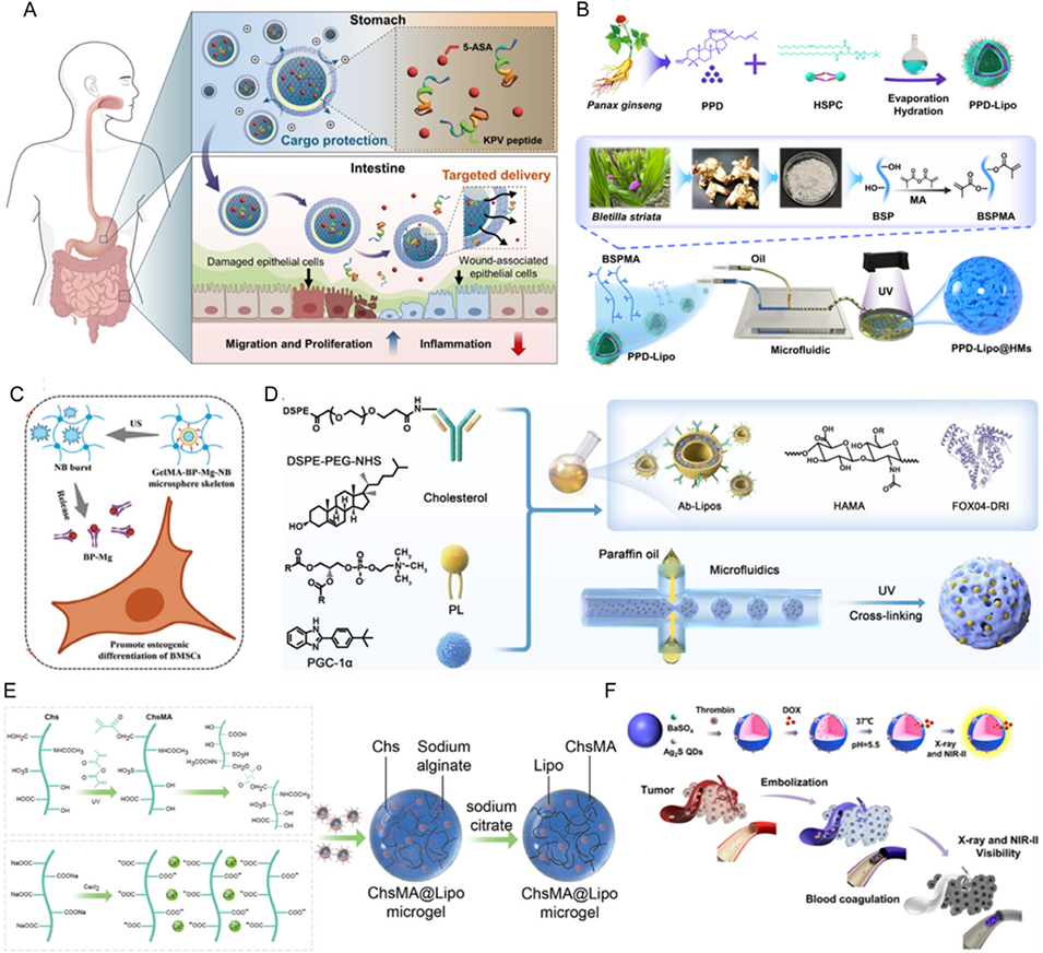 近年来,水凝胶成型技术取得了显著进展,并在生物医学领域得到了广泛应用。水凝胶作为一种三维聚合物网络结构,由亲水性聚合物组成,能够吸收并保留大量水分,同时保持其结构完整性和类似软组织的特性。然而,传统的块状水凝胶由于其毫米级的尺寸,在应用中常面临需要侵入性植入、营养扩散效率低以及细胞分布不均等问题。为了克服这些挑战,微米和纳米尺度的水凝胶结构,如微球(HMs),逐渐成为研究热点。HMs具有高比表面积、可调的机械性能和较大的设计灵活性,是实现特定生物功能的理想材料。