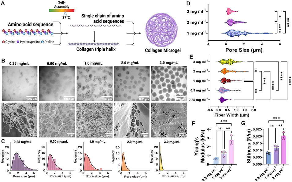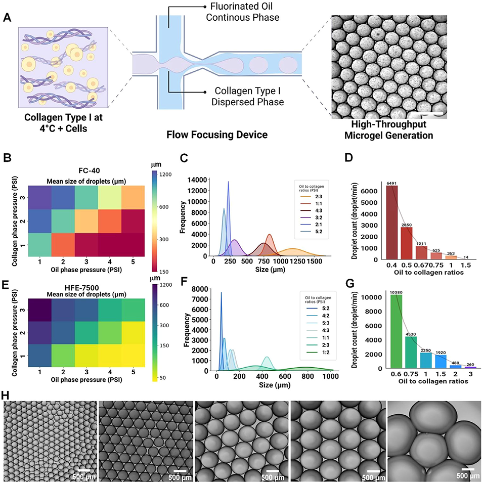 2、该平台通过调节胶原蛋白浓度(0.25-3 mg/mL)和热自组装过程,可制备尺寸(45-1000 µm)、纤维结构及机械性能(刚度0.6-2.8 kPa)可控的单分散微珠,生成速率超10,000个/分钟,且能保留胶原蛋白天然三螺旋结构。