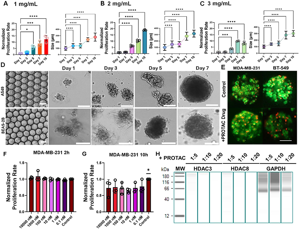 3、这些胶原蛋白微珠具有多种功能:作为模块化构建单元,可融入海藻酸盐-明胶生物墨水,提升流变稳定性、剪切变稀特性和3D打印保真度,支持细胞21天内增殖13倍;作为独立微生物反应器,可实现多细胞球体形成及持续的细胞外囊泡(EV)分泌与无损收集;还可用于高通量3D细胞培养和药物筛选,如对乳腺癌细胞进行PROTAC药物测试,成功降解目标蛋白HDAC3和HDAC8。
