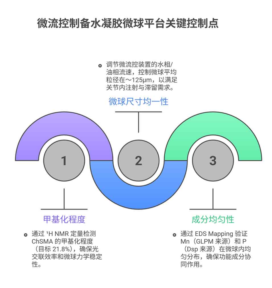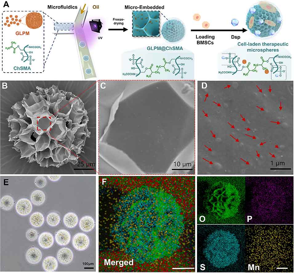 2、微球设计与制备:以甲基丙烯酰化硫酸软骨素(ChSMA)为水凝胶基质,通过紫外辅助微流控技术制备均匀微球(约125μm),共载灵芝多糖还原的二氧化锰纳米酶(GLPM)、地塞米松磷酸钠(Dsp)和骨髓间充质干细胞(BMSCs)。
