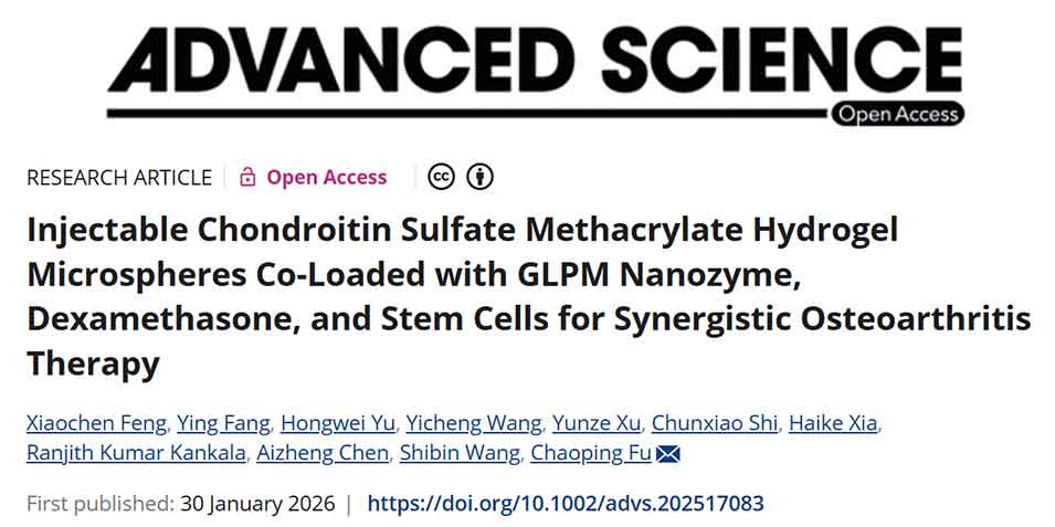 近期,华侨大学傅超萍副教授团队采用紫外辅助微流控技术开发了一种可注射的甲基丙烯酰化硫酸软骨素(ChSMA)水凝胶微球平台,其共载灵芝多糖还原的二氧化锰纳米酶(GLPM)、地塞米松磷酸钠(Dsp) 和骨髓间充质干细胞(BMSCs),集成抗氧化、抗炎和再生功能,用于骨关节炎(OA)局部治疗。相关研究以“Injectable Chondroitin Sulfate Methacrylate Hydrogel Microspheres Co-Loaded with GLPM Nanozyme, Dexamethasone, and Stem Cells for Synergistic Osteoarthritis Therapy”为题,发表在期刊《Advanced Science》上。