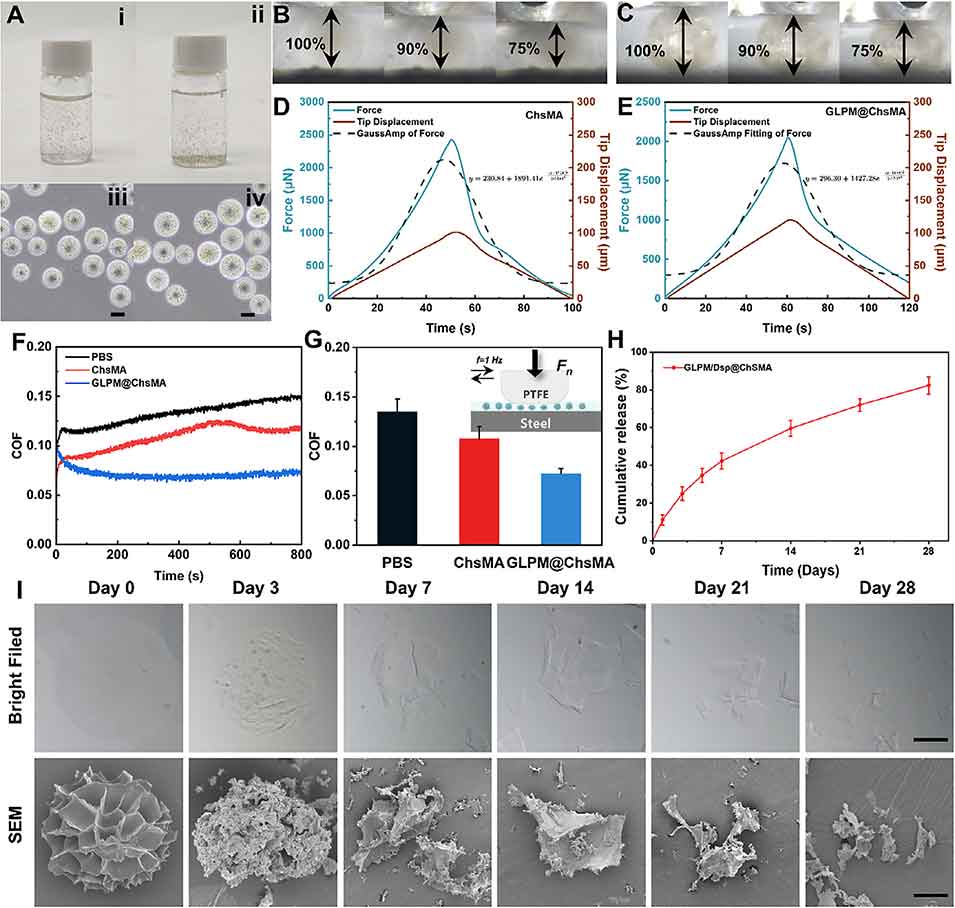 图4 GLPM/Dsp@ChSMA水凝胶微球的可注射性及理化性质评价
