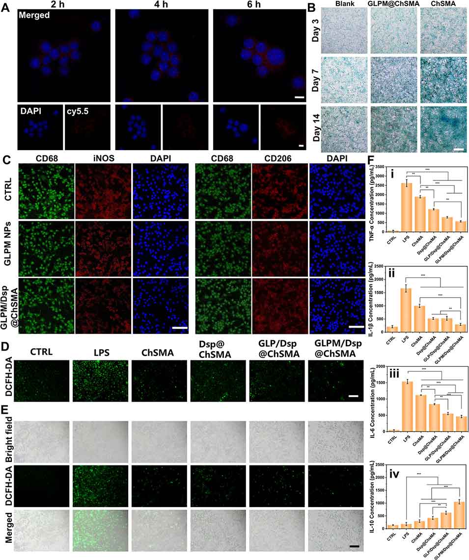 图5 GLPM纳米颗粒及GLPM/Dsp@ChSMA水凝胶微球的细胞相容性、细胞摄取、巨噬细胞极化、ROS清除及炎症因子调控的体外评价