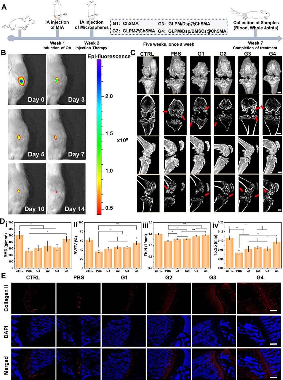 1、该研究开发了一种可注射的多功能水凝胶微球平台(GLPM/Dsp@ChSMA),用于骨关节炎(OA)的协同治疗。