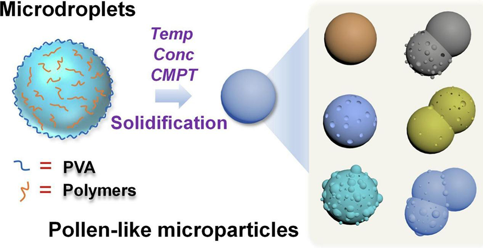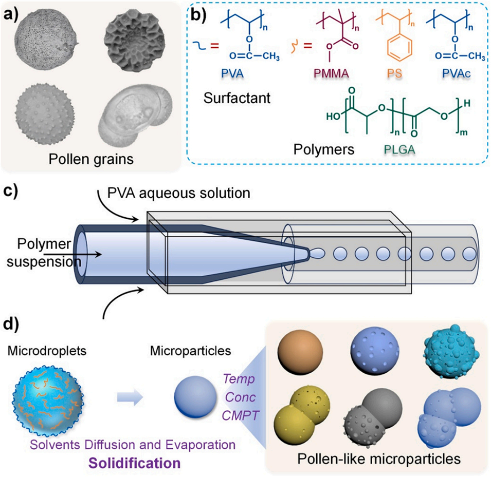 该研究制备仿生花粉状微粒的核心技术原理在于PVA稳定的微液滴生成与溶剂扩散蒸发诱导固化:以PVA水溶液为连续相、含聚合物的氯仿溶液为分散相,通过微流控装置生成单分散水包油微液滴,PVA吸附于液-液界面提供空间位阻以稳定微滴、防止聚并;后续通过孵育使氯仿缓慢扩散与蒸发,聚合物逐渐固化形成具有仿生形貌的花粉状微粒。