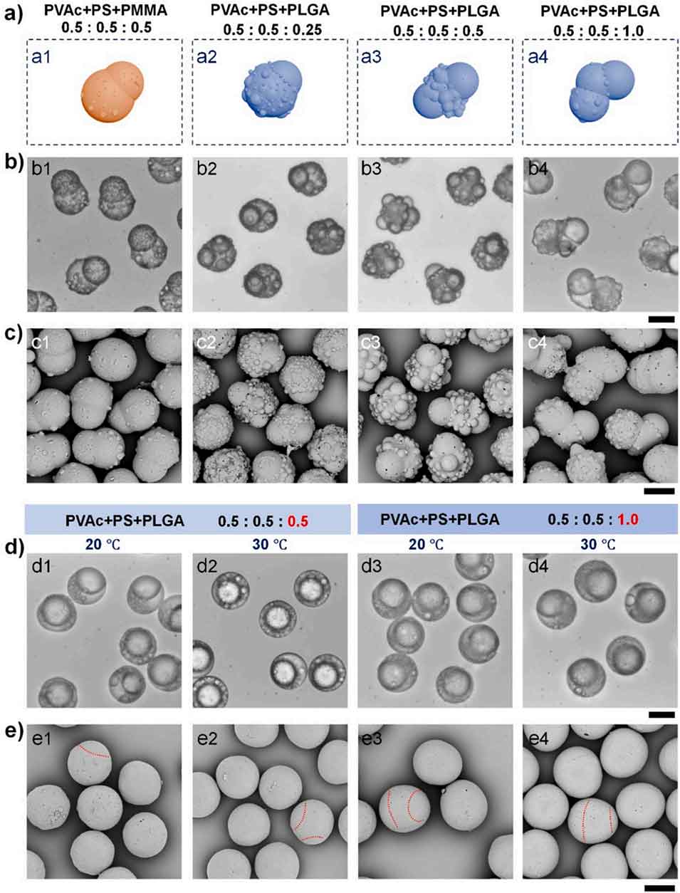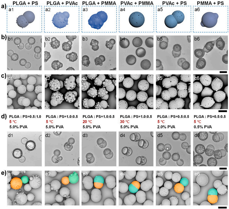 图6 通过调节微滴内聚甲基丙烯酸甲酯(PMMA)浓度,可控制备含聚乙酸乙烯酯(PVAc)、聚苯乙烯(PS)、聚乳酸-羟基乙酸共聚物(PLGA)和 PMMA 的四组分聚合物微粒。水溶液中 PVA 浓度为 5%(质量体积比),PS、PVAc 和 PLGA 的浓度均固定为 0.5%(质量体积比)。(a) 5℃孵育条件下,含 0.1%(a1)、0.3%(a2)和 0.5%(质量体积比)(a3)PMMA 的四组分聚合物微粒的光学显微照片。(b) 所制备四组分聚合物微粒的 SEM 图像。所有比例尺均为 25 μm。