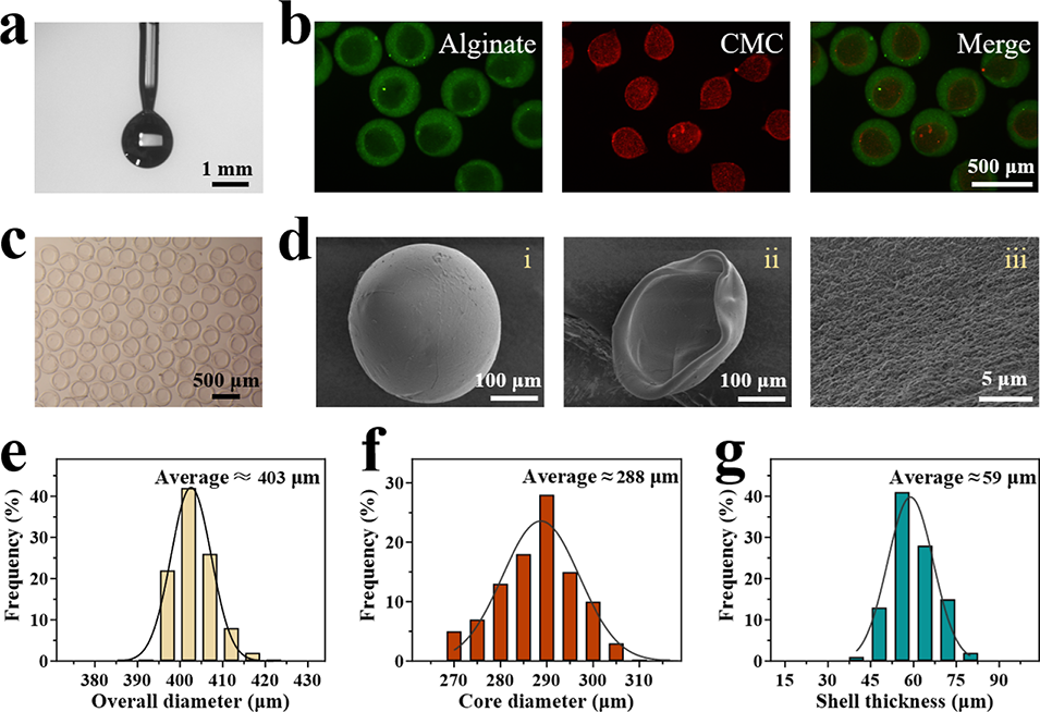 图2 (a)无电压条件下CMC/海藻酸盐液滴形成的实时图像;(b) 核(红色)-壳(绿色)微胶囊的荧光图像;(c)均一核-壳结构水凝胶微胶囊的光学图像;(d)扫描电子显微镜(SEM)图像:(i)完整的CMC/海藻酸盐微胶囊,(ii)微胶囊的内部结构,(iii)微胶囊的内表面;(e)CMC/海藻酸盐微胶囊总直径分布;(f)CMC/海藻酸盐微胶囊核尺寸分布;(g)CMC/海藻酸盐微胶囊壳厚度分布。