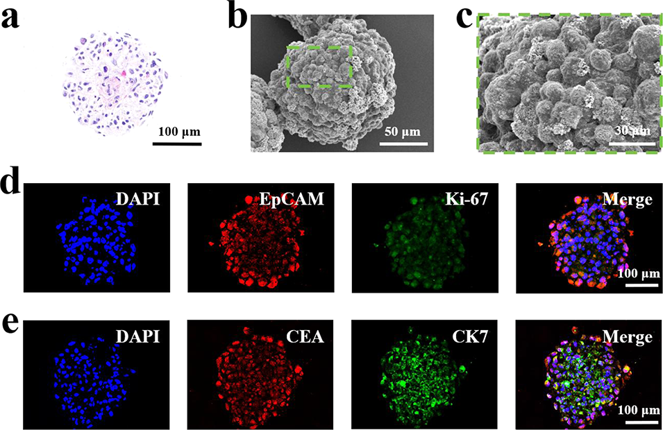 图4 微胶囊中培养的肿瘤球状体复刻亲本肿瘤的组织学特征。(a)微胶囊中培养的胃癌肿瘤球状体的苏木精-伊红(H&E)染色切片;(b、c)扫描电子显微镜(SEM)图像:(b)完整球状体结构,(c)表面形态的高倍镜观察结果;(d)免疫荧光法检测球状体中EpCAM和Ki-67的表达谱;(e)免疫荧光法检测球状体中CEA和CK7的表达谱。
