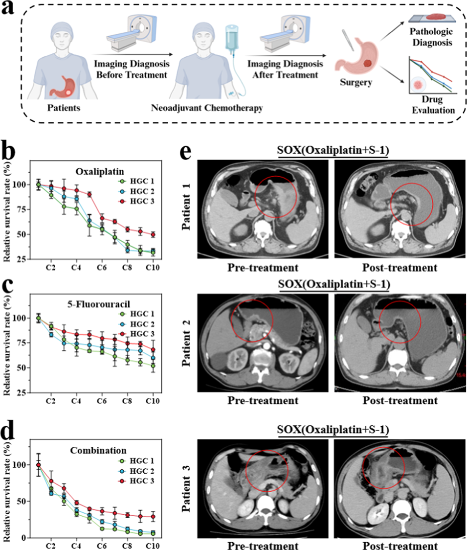 图6 (a)临床结果一致性分析示意图(使用https://BioRender.com制作);(b-d)三名不同患者来源的肿瘤球状体对不同治疗方案的反应:(b)暴露于奥沙利铂72小时,(c)暴露于5-氟尿嘧啶72小时,(d)芯片上暴露于奥沙利铂与5-氟尿嘧啶联合用药72小时(每组n=30),数据以C1组为参照进行归一化处理;(e)患者1、患者2和患者3治疗前后的计算机断层扫描(CT)图像。