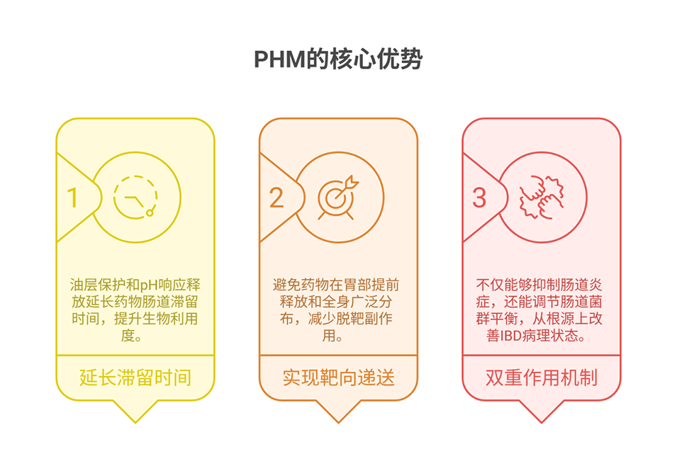 5、在DSS诱导的IBD小鼠模型中,PHM能延长PTX在肠道的滞留时间,显著减轻体重下降、结肠缩短等症状,使疾病活动指数(DAI)降低38.5%,同时抑制IL-1β、IL-6、TNF-α等促炎因子表达,减少巨噬细胞浸润,修复肠道黏膜屏障。