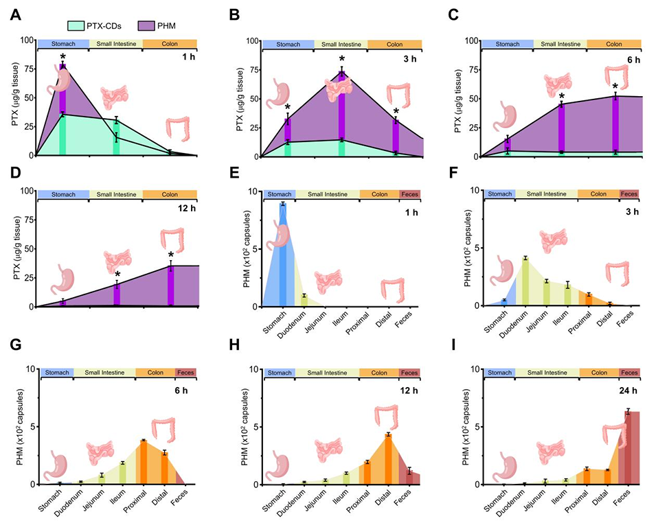 图3. PTX和PHM的生物分布。ICR小鼠口服给予PTX-碳点(PTX-CDs,100 mg/kg)或封装PTX-CDs的PHM(1×10⁴个胶囊/mL,相当于100 mg/kg PTX-CDs)后,PTX在胃肠道组织中的分布情况。在1h(A)、3h(B)、6h(C)和12h(D)时对组织匀浆中的PTX浓度进行定量,采用分光光度法,激发/发射波长为362-396 nm/432-480 nm。*p≤0.05 vs PTX-CDs。数据以平均值±标准偏差表示(n=5)。口服给药壳层掺入荧光素异硫氰酸酯-葡聚糖(FITC-DEX,分子量=2,000,000)的PHM(浓度为1×10⁴胶囊/mL)后,PHM在胃肠道中的时间依赖性分布和清除情况。在给药后1h(E)、3h(F)、6h(G)、12h(H)和24h(I)时,对胃、小肠、结肠和粪便中的荧光信号进行定量,采用FITC荧光检测(激发波长488nm,发射波长520nm)。数据以平均值±标准偏差表示(n=5)。