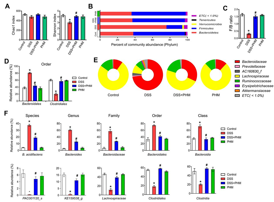 图6. PHM有助于平衡和改善肠道微生物群组成。(A)采用Shannon指数和Chao1指数分别评估微生物均匀度、群落多样性以及物种丰富度。*p≤0.05 vs对照组,#p≤0.05 vs DSS组。n=3。(B)门水平上群落丰度百分比的柱状图。(C)DSS处理小鼠在给予或不给予PHM后的厚壁菌门与拟杆菌门(F/B)比值。*p≤0.01 vs对照组,#p≤0.01 vs DSS组。n=3。(D)目水平上微生物类群相对丰度的柱状图。*p≤0.01 vs对照组,#p≤0.01 vs DSS组。n=3。(E)采用饼图展示肠道微生物群的科水平分类组成。(F)箱线图展示每个样本中两种优势物种(产酸拟杆菌和PAC001120)的肠道分类群。*p≤0.01 vs对照组,#p≤0.01 vs DSS组。n=3。