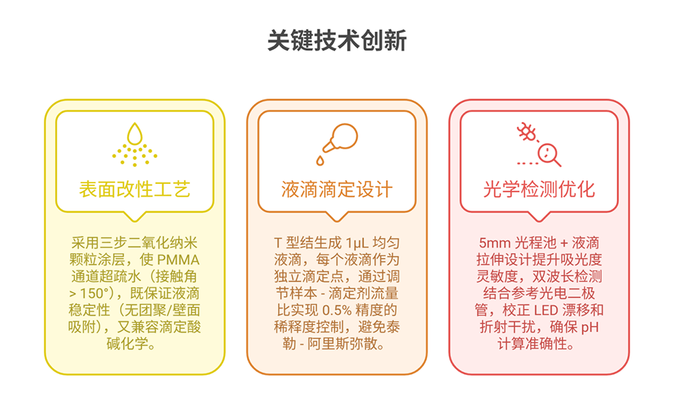 2、传感器采用三步二氧化硅纳米颗粒涂层法使PMMA通道超疏水,集成芯片上吸光度检测与多点分光光度滴定,每个液滴作为独立滴定点;优化了微流控芯片设计,含四个注射泵、十一个电磁阀,搭配空气流量阻尼器稳定流速,通过特定光学单元设计提升检测灵敏度。