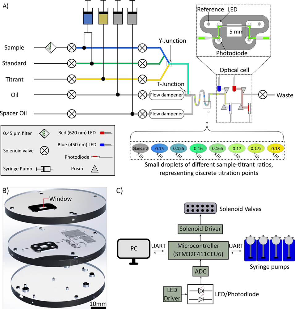 图1. 液滴微流控总碱度(TA)传感器设计。(A) 芯片实验室(LoC)液滴微流控传感器的流体示意图,包含四个注射器泵、十一个电磁阀和光学池。在T型结处形成具有不同样本-滴定剂比例的液滴,每个液滴作为独立滴定点,进行10次重复测量。(B) 芯片的CAD设计图。流体通道通过微铣加工制成于底部PMMA层,光学池由两层透明PMMA之间嵌入黑色PMMA嵌件构成。(C) 控制系统框图。STM32 BlackPill微控制器和定制PCB板负责自动化控制,电脑用于编写脚本并向微控制器上传配置参数。