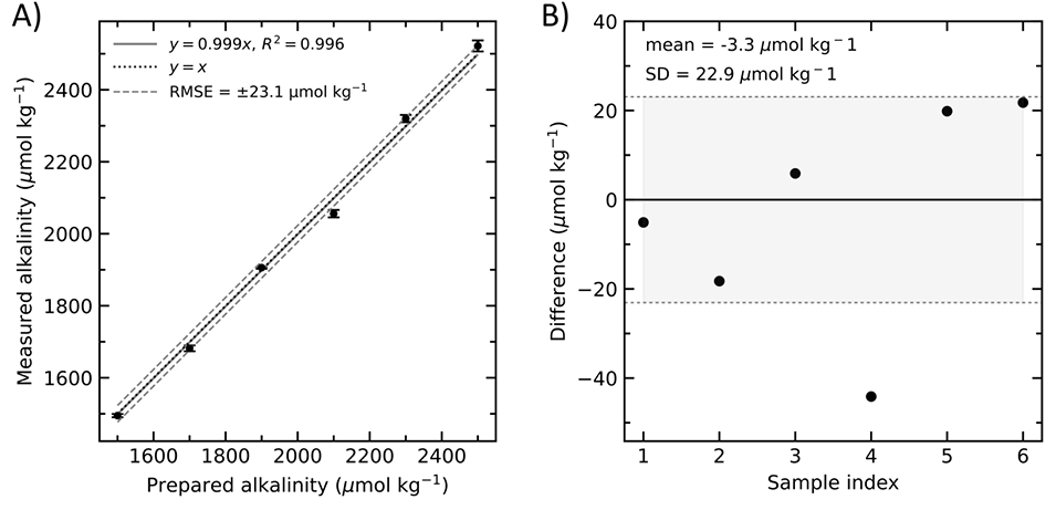 图5. 校准曲线与残差分析。(A) 测量总碱度(TA)值相对于制备的碳酸钠(Na₂CO₃)总碱度标准品的校准曲线。灰色实线为数据的线性回归拟合线(y=0.999x,R2=0.996),虚线为1:1等效线,点划线表示±均方根误差(RMSE)边界(±23.1 µmol kg⁻¹),误差棒代表重复测量的标准差。(B) 各校准点的测量TA值与制备TA值的残差。水平实线表示零偏差,阴影区域对应残差的±1标准差。平均残差(−3.3 μmol kg−1)反映测量准确度,残差的标准差(22.9 µmol kg⁻¹)量化了校准范围内随机不确定度与线性度的综合影响。