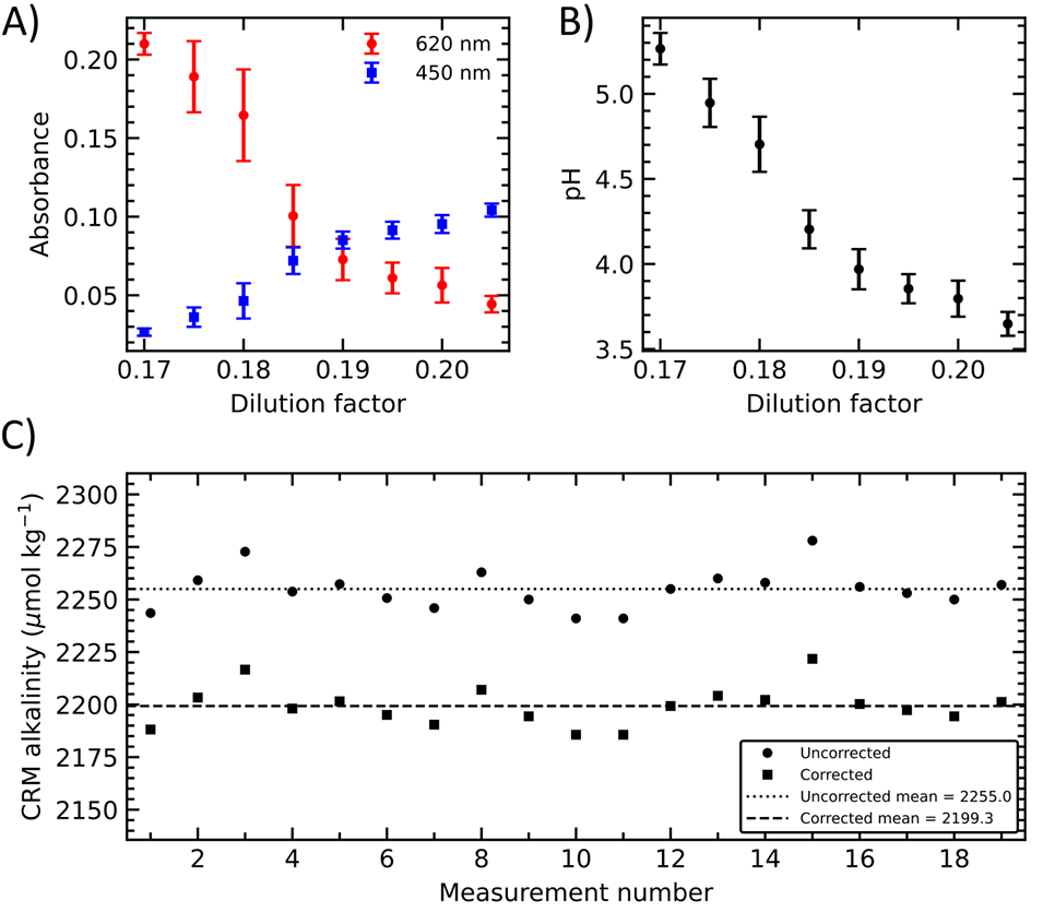 图4. 芯片上总碱度(TA)测量结果。(A) 450nm和620nm波长下的芯片上液滴吸光度测量值。每个数据点代表10个液滴在特定稀释因子(0.15~0.195,酸体积/总体积)下的平均吸光度。(B) 基于各稀释因子下的测量吸光度比值计算得到的对应pH值,误差棒表示标准差(1σ)。(C) 重复CRM测量结果。虚线表示CRM的标准总碱度值(207批次,TA=2199.32±0.79 μmol kg−1);黑色圆圈为测量得到的TA值,平均值为2255±9.31 μmol kg−1;黑色方块为校正后的TA值,标准差为9.08 μmol kg−1,该值定义为传感器的精度。