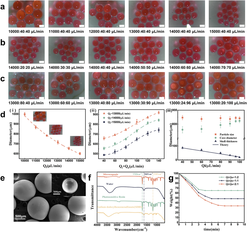 图2 通过流动参数调控微胶囊形貌:(a) 不同驱动相流速(10000 μL/min 至 15000 μL/min)下的微胶囊形貌;(b) 不同内外相总流速(40 μL/min 至 140 μL/min)下的微胶囊形貌;(c) 不同内外相流速比(5:1 至 1:2)下的微胶囊形貌;(d) 对应 (a) 驱动相流速(Qf)、(b) 内外相总流速(Qi+Qo)及 (c) 流速比的微胶囊统计数据,分别标记为 (i-iii);(e) 微胶囊完整状态与破裂状态的扫描电子显微镜(SEM)图像;(f) 傅里叶变换红外(FTIR)光谱结果;(g) 不同内外相流速比(1:2、1:1、2:1)微胶囊的热重分析(TGA)结果。比例尺:500 μm。
