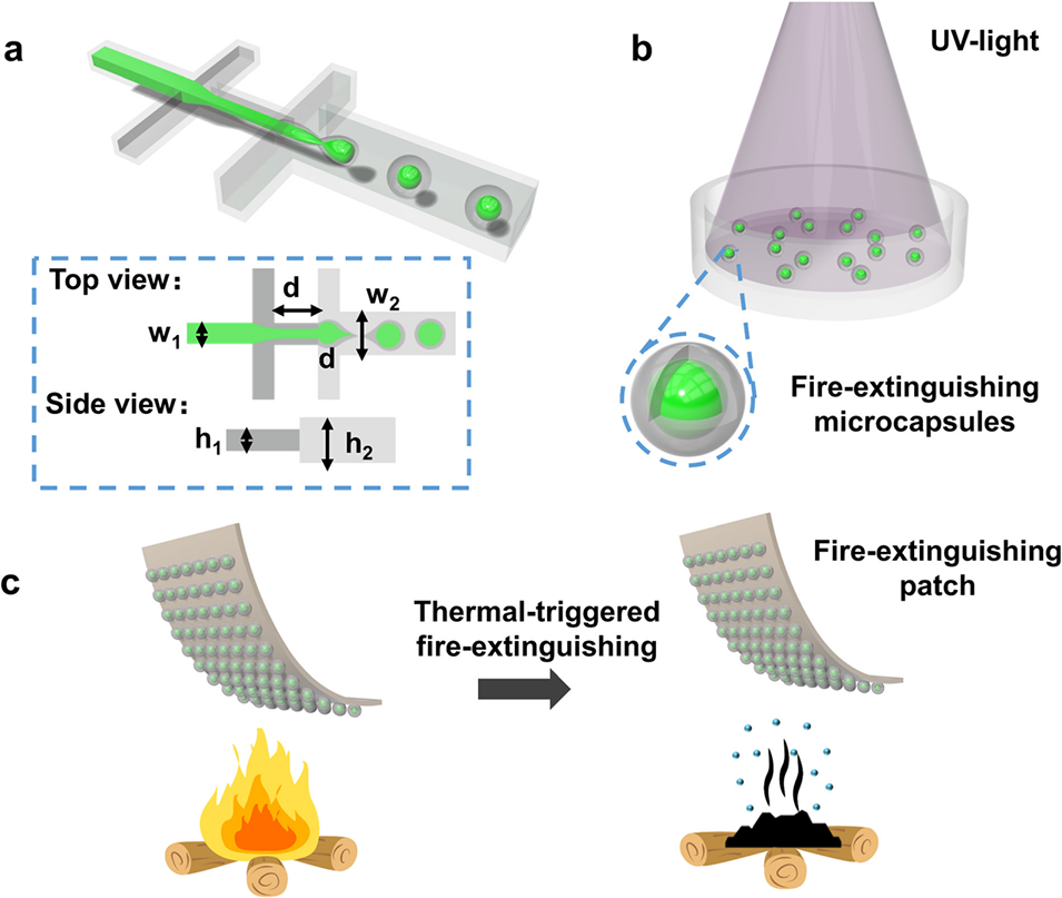 图1 热响应型灭火微胶囊的制备及工作原理示意图:(a) 利用流动聚焦装置通过微流控技术制备前驱体液滴;(b) 液滴在紫外光照射下发生光聚合反应,形成稳定的核壳结构微胶囊;(c) 灭火贴片的工作机制:火焰产生的热量触发微胶囊破裂,释放水基灭火剂。
