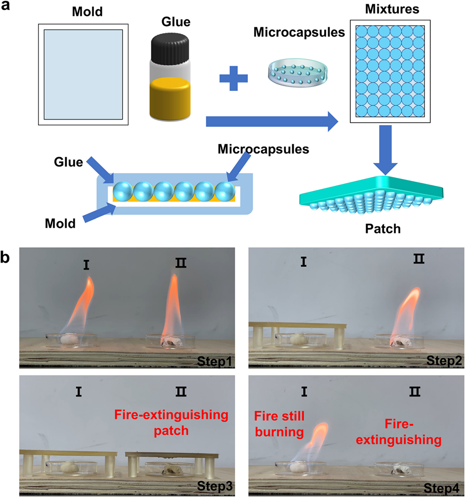 图6 热响应灭火贴片的制备与应用:(a) 热响应灭火贴片的制备流程示意图;(b) 热响应灭火贴片性能评价的实验装置示意图。