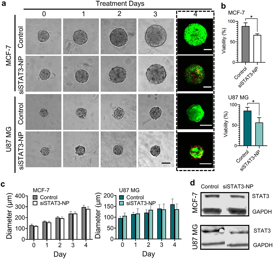 图5. 利用3D肿瘤球状体评价纳米药物的治疗效果。(a)MCF-7和U87 MG球状体经游离 siSTAT3(对照组)或siSTAT3载药纳米颗粒(siSTAT3-NP 组)处理后,在第0、1、2、3天的形态变化明场代表图像;第4天的活/死细胞荧光图像(虚线框标注)显示不同处理组的细胞活力差异,比例尺:100μm;(b)MCF-7和U87 MG球状体经处理后的细胞活力定量分析(平均值±标准差,n=3),采用双尾非配对t检验计算P值,*p<0.05,**p<0.01,***p<0.001,****p<0.0001,无标记为无统计学差异;(c)对照组和siSTAT3-NP组中,MCF-7和U87 MG肿瘤球状体在治疗期间的平均直径变化(平均值±标准差,n=3);(d)对照组和siSTAT3-NP组球状体中STAT3蛋白表达水平的蛋白质印迹代表图像。