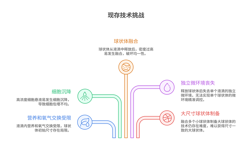 4、平台优势与局限性:相较于悬滴法、液体覆盖培养等传统肿瘤球状体生成方法,该液滴微流控平台兼具高通量、尺寸均一、微环境可精准调控的优势,提升了药物筛选的可靠性和可重复性;但目前存在球状体尺寸受液滴空间限制、高浓度细胞易沉降、球状体释放后易融合等技术挑战。