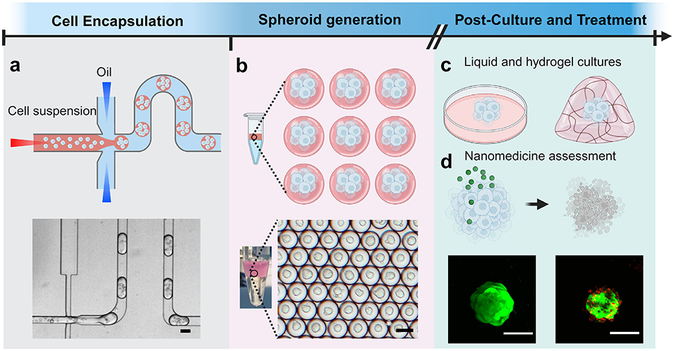 图1. 基于液滴微流控平台的肿瘤球状体制备及纳米药物评价流程示意图。(a)肿瘤细胞在微流控器件的流动聚焦区域包封于微液滴内;(b)肿瘤球状体在微液滴内形成;(c)从微液滴中释放的球状体在液体培养基和水凝胶基质中培养,以支持其进一步生长发育;(d)将制备得到的肿瘤球状体用于siRNA纳米药物的治疗效果评估。比例尺:100μm。