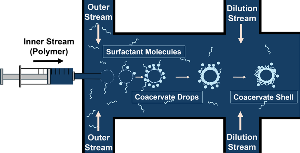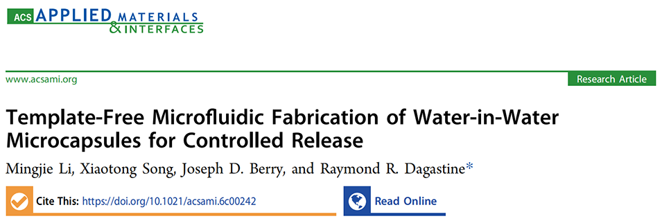 近期,墨尔本大学研究团队首次提出了一种无模板微流控制备水包水微胶囊的新策略,突破了传统微胶囊制备依赖不混溶两相体系的限制,实现了在完全互溶的水单相体系(AOPS)中通过局部凝聚形成微胶囊。相关研究以“Template-Free Microfluidic Fabrication of Water-in-Water Microcapsules for Controlled Release”为题目,发表于期刊《ACS Applied Materials & Interfaces》。