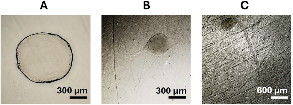 图2. Hirox光学显微镜下微胶囊的典型形貌:(a)准球形微胶囊(长径990μm、短径891μm,形状指数为0),由脉冲时长1秒、脉冲间隔10秒的条件制备而成;(b)短尾型微胶囊(长径974μm、短径741μm,形状指数为1.55),由脉冲时长0.75秒、脉冲间隔7秒的条件制备而成;(c)长尾型微胶囊(长径476μm、短径436μm,形状指数为4.4),由脉冲时长0.75秒、脉冲间隔3秒的条件制备而成。