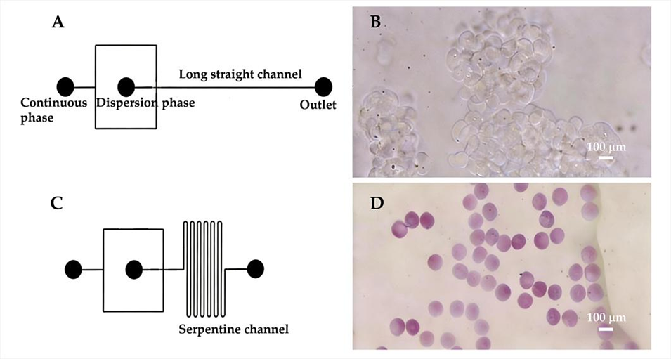图2. 不同固化微通道结构对微球制备效果的影响。(A)长直型固化通道、(C)蛇形固化通道,二者对应的水凝胶微球制备结果分别如(B)、(D)所示。
