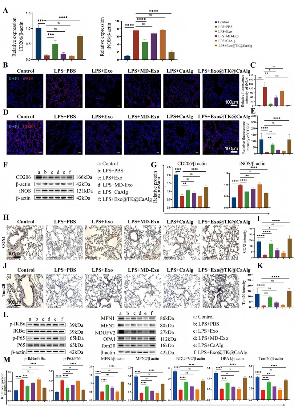 3、在LPS诱导的小鼠ALI模型中,雾化递送的Exo@TK@CaAlg微球可在肺组织长效滞留,有效减轻肺组织病理损伤,降低肺泡毛细血管通透性、减少蛋白渗出和炎症细胞浸润;同时缓解体内氧化应激,抑制NF-κB炎症通路激活,恢复肺组织线粒体相关蛋白表达,显著改善小鼠肺功能,且疗效优于单纯外泌体、CaAlg微球等对照组。