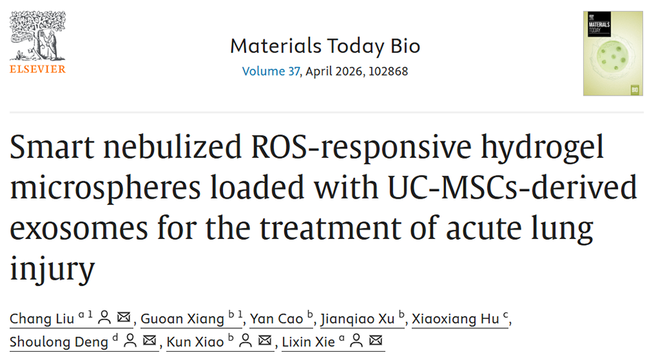 近期,解放军总医院第八医学中心呼吸与危重症医学部解立新教授团队成功构建了一种负载人脐带间充质干细胞外泌体的活性氧响应型水凝胶微球(Exo@TK@CaAlg)。该微球不仅可有效清除过量ROS,还能在ALI氧化应激微环境中响应性释放外泌体,在动物模型中通过雾化吸入给药后,显著减轻肺部炎症、修复线粒体功能并促进巨噬细胞向抗炎表型转化,为ALI/ARDS治疗提供了极具前景的新策略。相关研究以“Smart nebulized ROS-responsive hydrogel microspheres loaded with UC-MSCs-derived exosomes for the treatment of acute lung injury”为题目,发表于期刊《Materials Today Bio》。