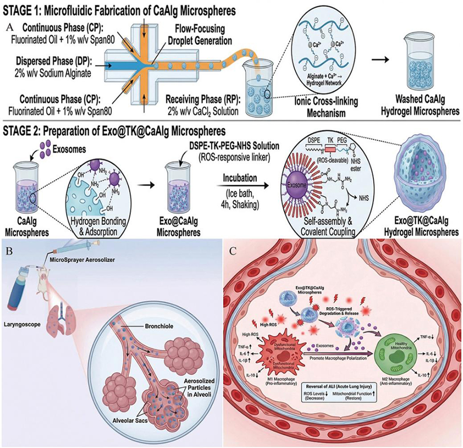 1、通过微流控技术制备海藻酸钙(CaAlg)微球,引入硫缩酮(TK)键赋予其ROS清除和响应性,结合物理吸附与共价偶联负载外泌体,制得的Exo@TK@CaAlg微球粒径约5μm,生物相容性优异,可通过雾化递送,且仅在ROS高表达的ALI病理微环境中特异性释放外泌体,具备良好的肺靶向性。